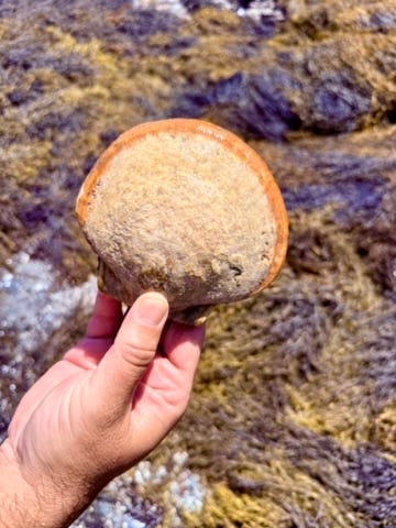 “I found it deep at the bottom, just past the low tide line. There are tons of them down there. It’s like a graveyard of scallops.”